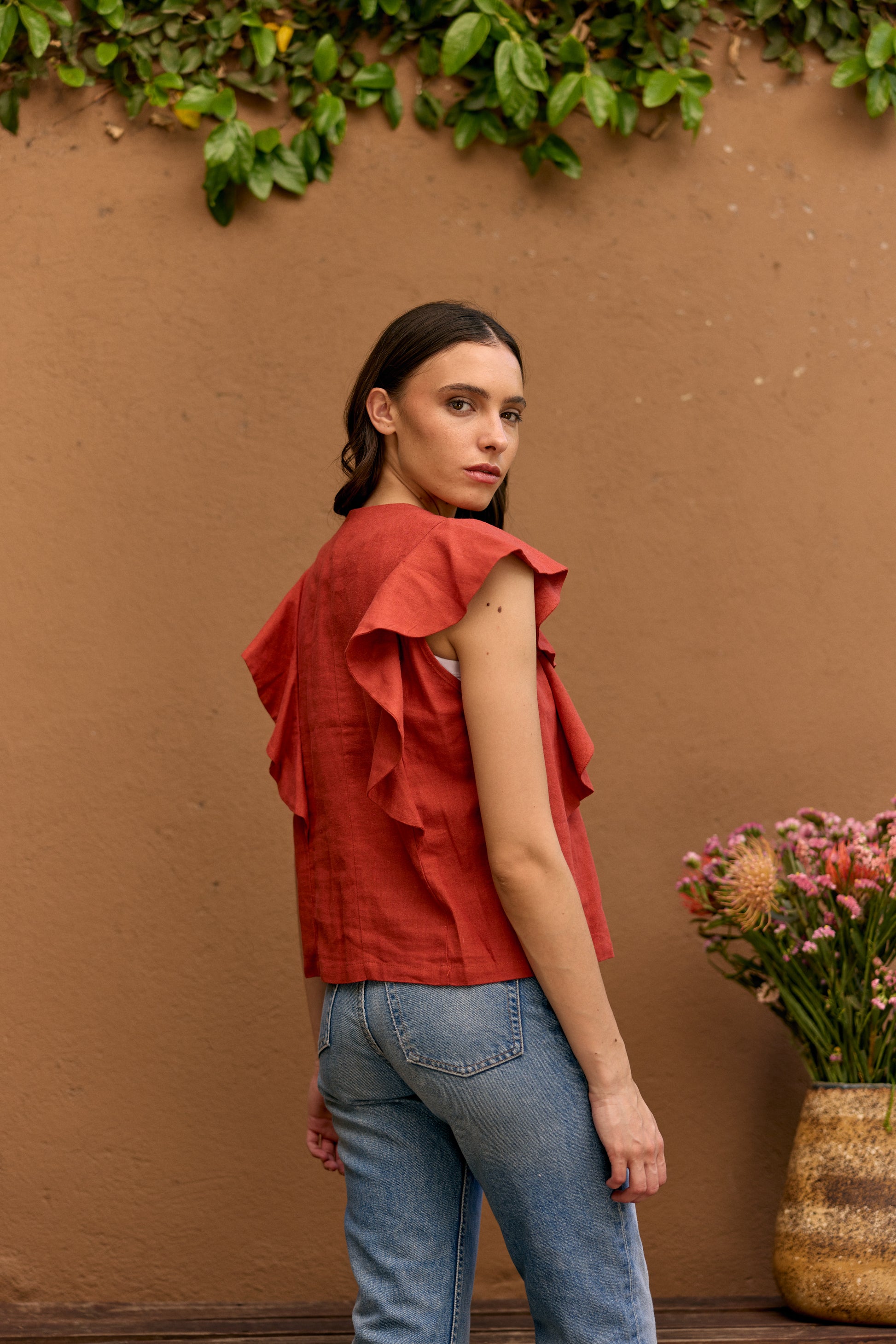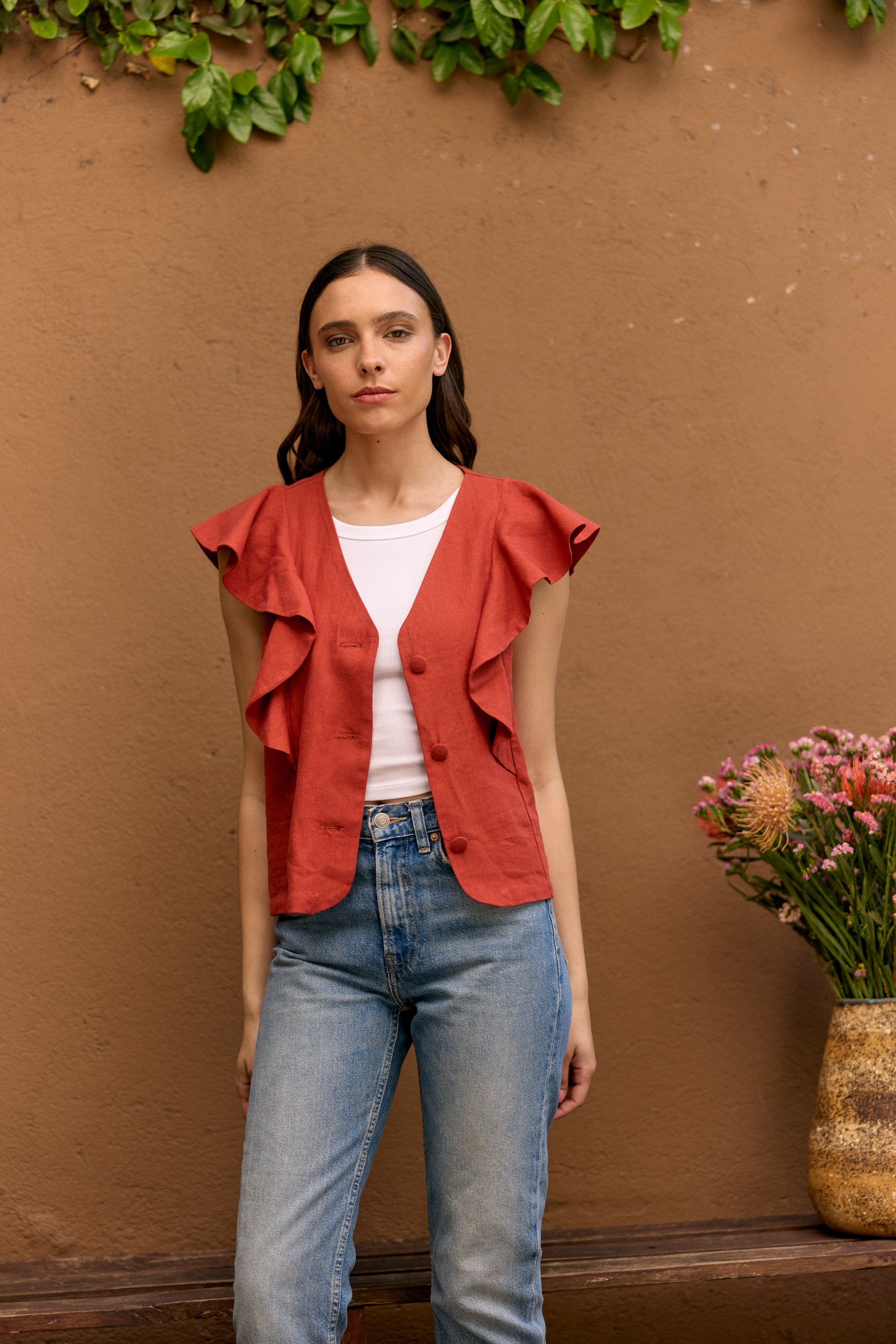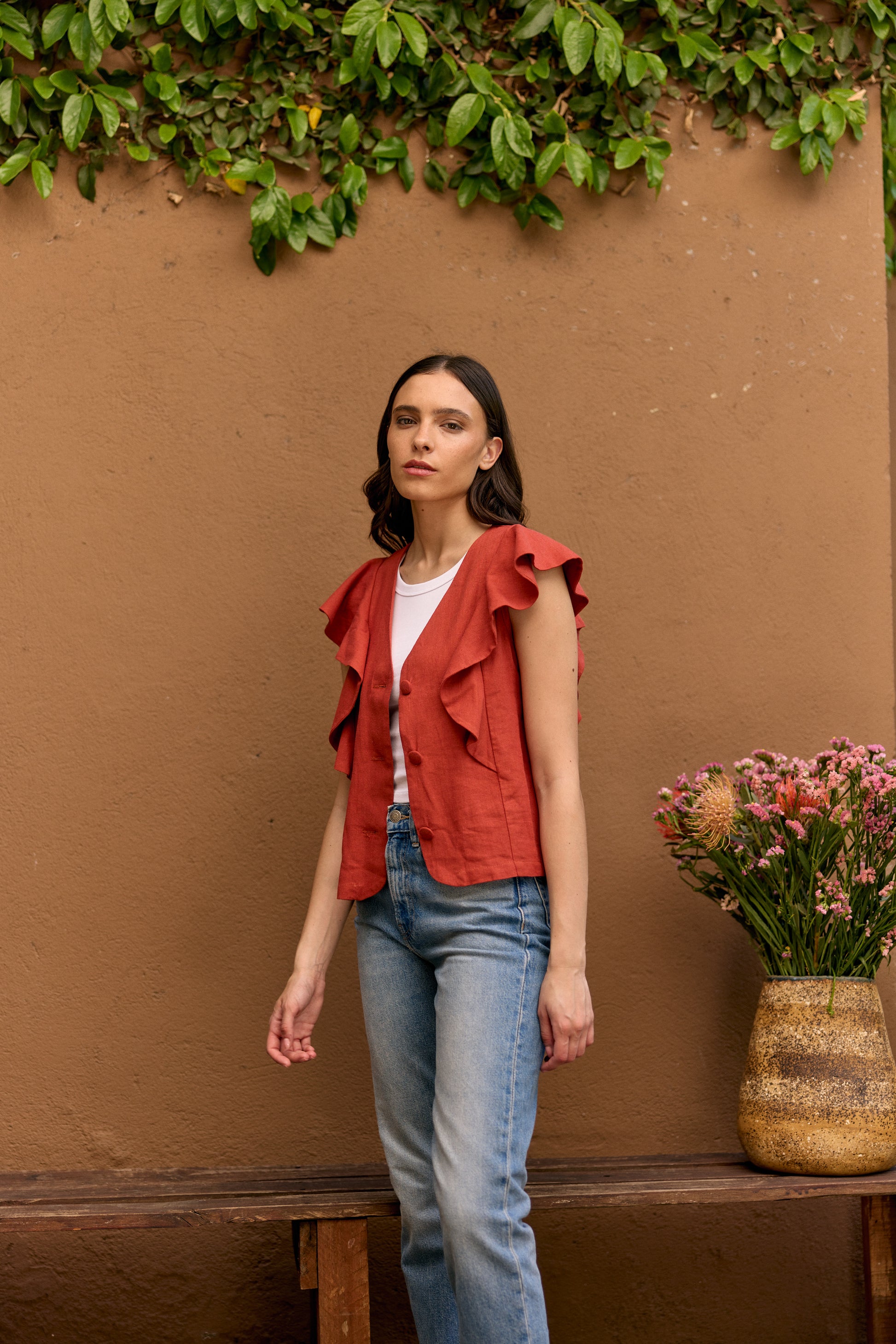 Gillette de lino con grandes vuelos que añade un toque de personalidad y romanticismo, elevando instantáneamente cualquier look.
