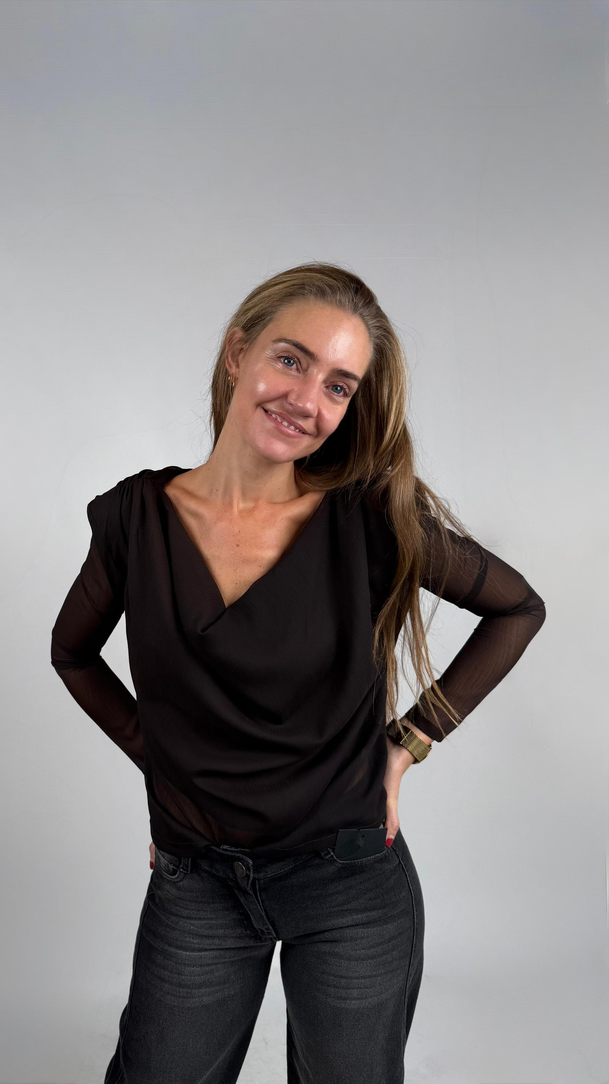 La blusa Violeta destaca por su estilo glam. Tiene hombreras que aportan definición a la silueta, y una textura de transparencias que le aporta un toque sexy. Es versátil y se puede combinar fácilmente con una variedad de prendas, como tus jeans favoritos.