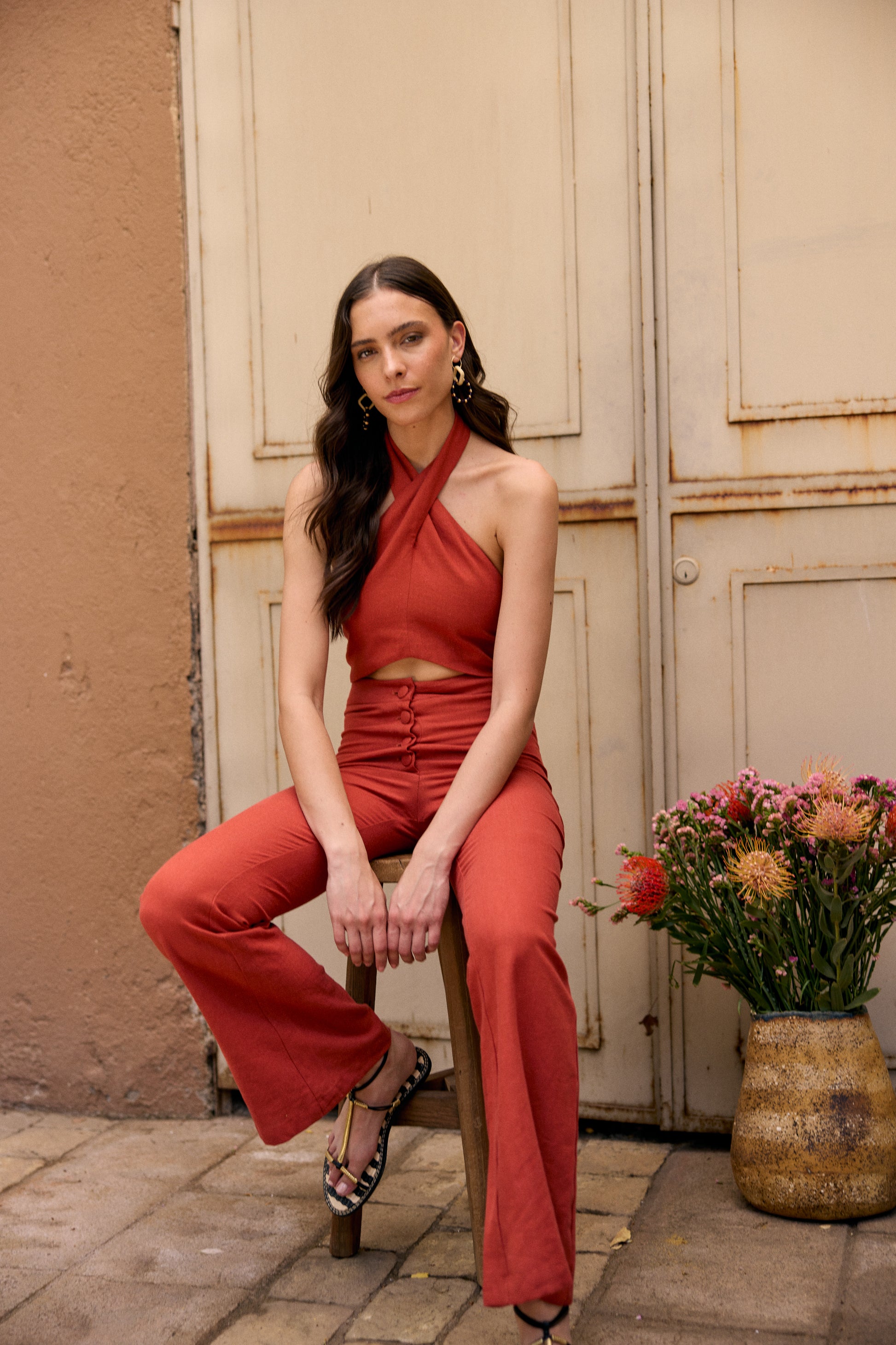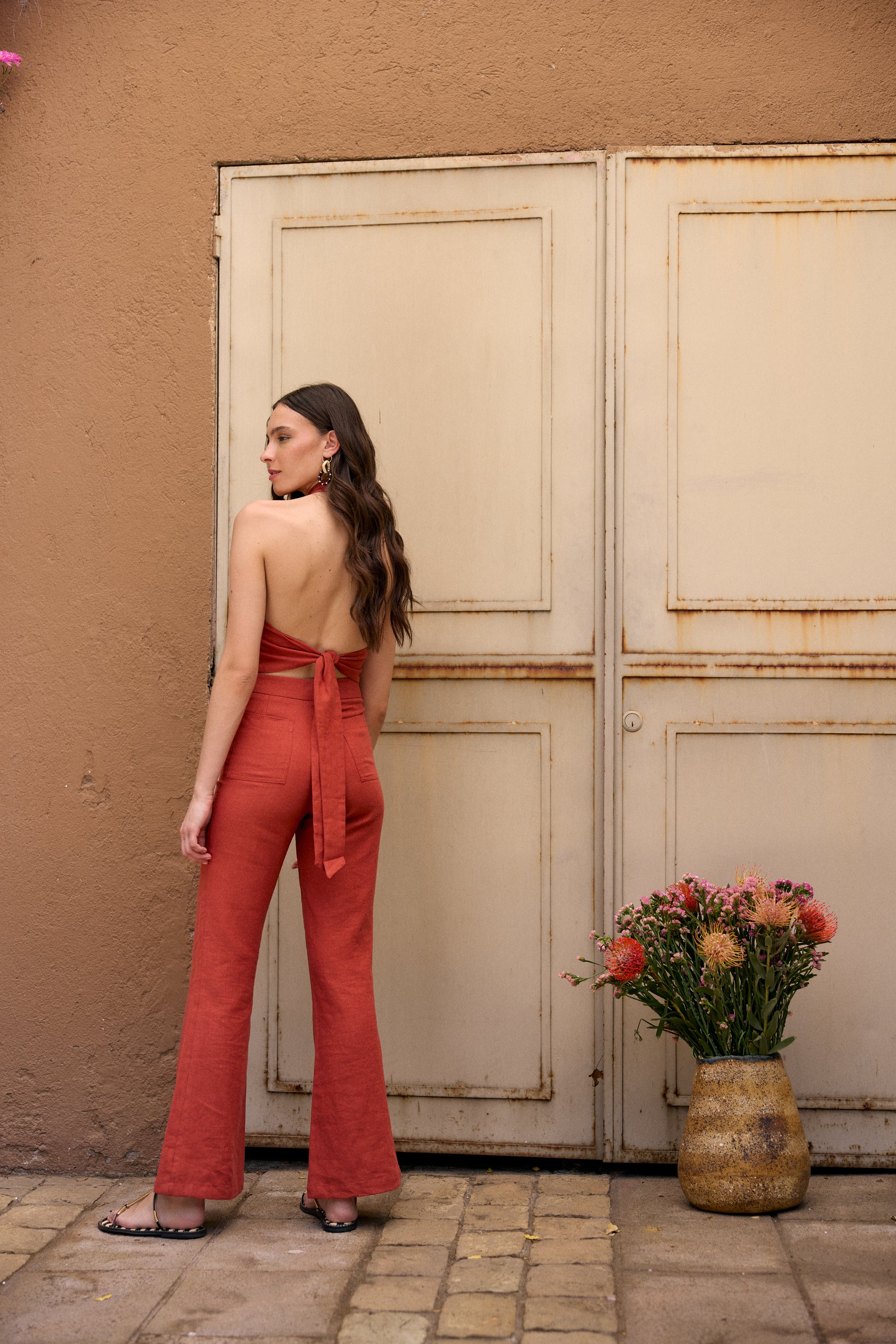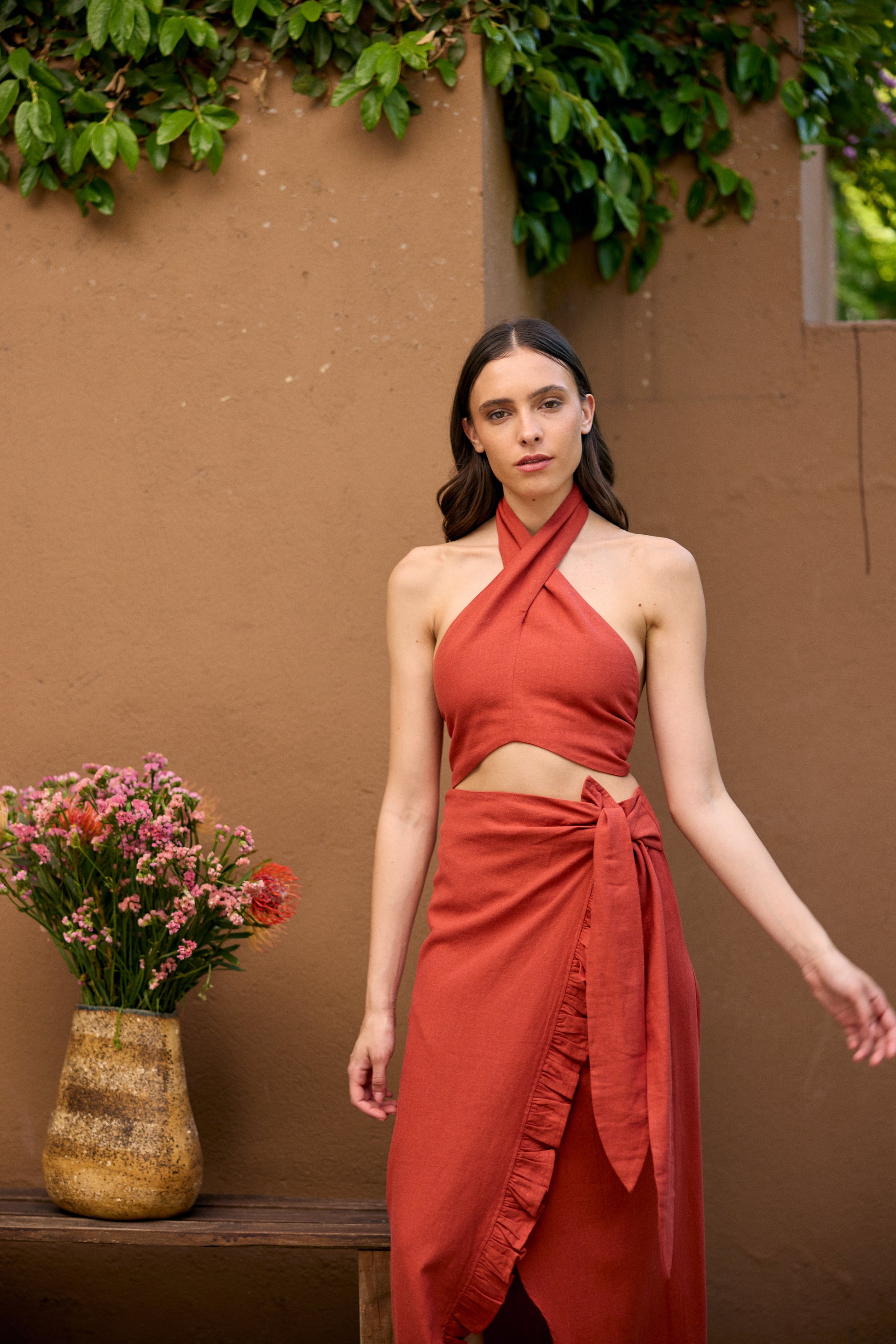 Top de lino halter adaptable que se ajusta a tu estilo.