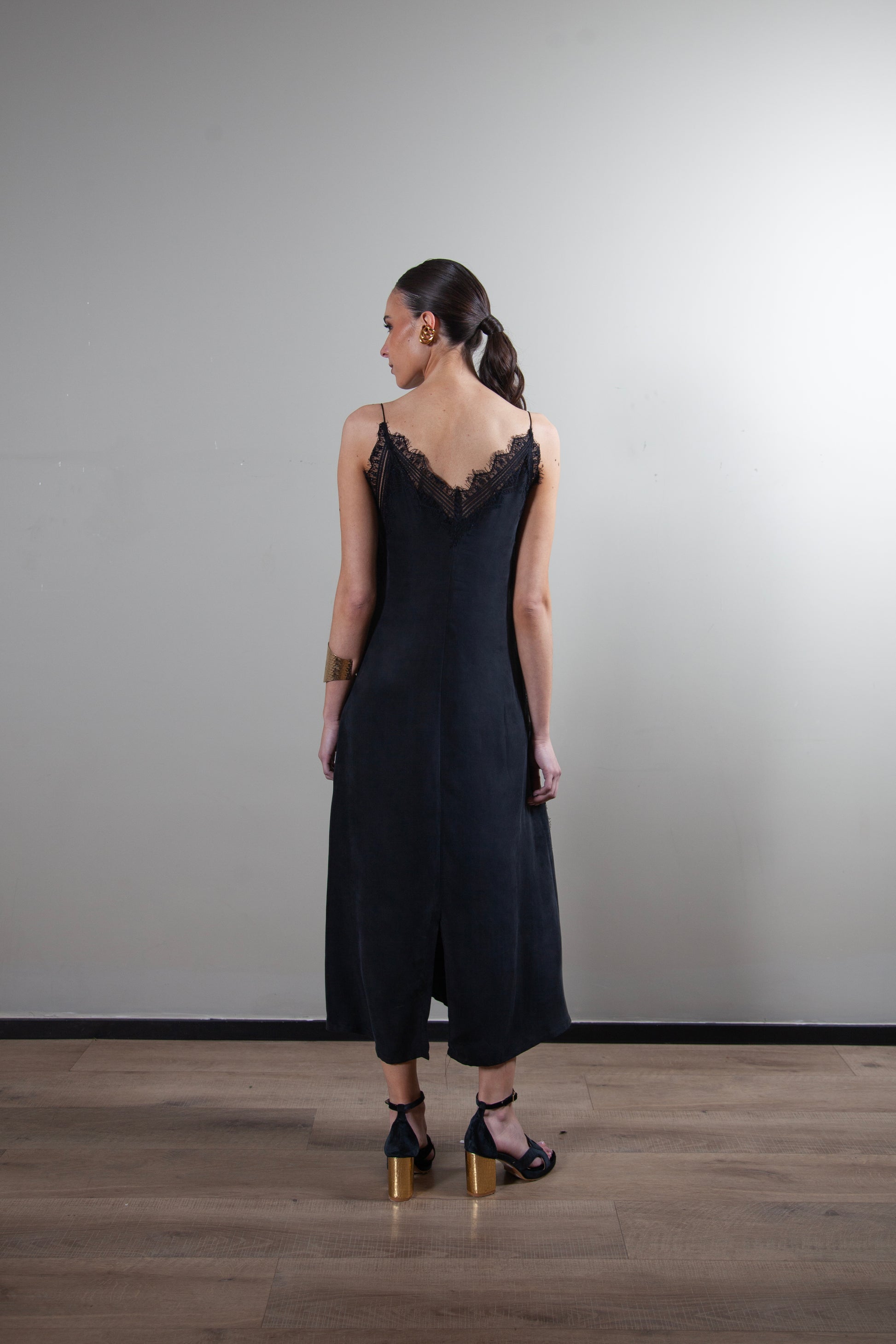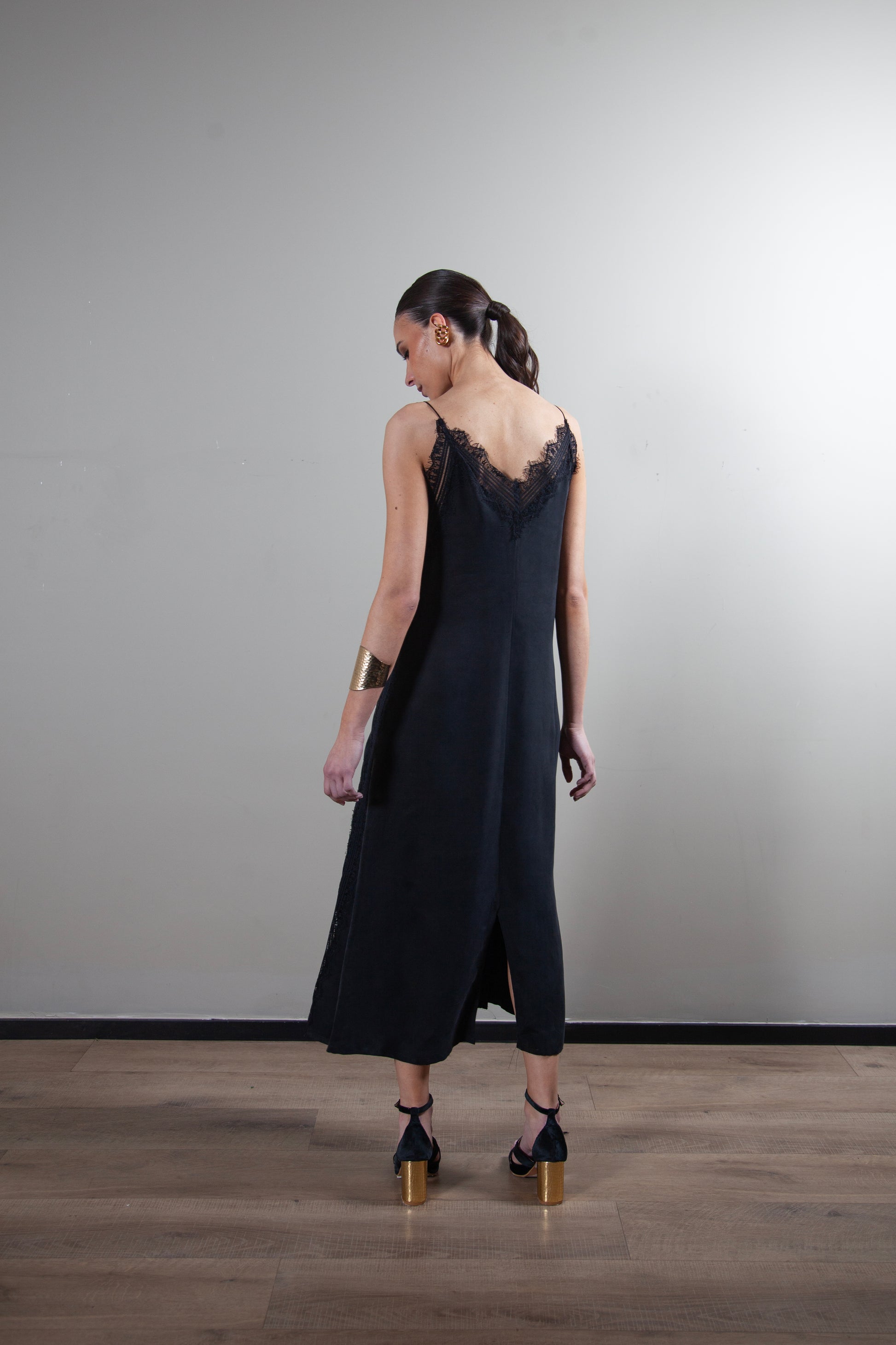 El vestido Jacinta es un vestido lencero elegante y minimalista. Confeccionado en una mezcla de cupro y viscosa, su tacto es sedoso y su caída fluida, abrazando la silueta con delicadeza. Su diseño atemporal lo hace ideal para combinar con sandalias para un look de verano, con botas y una chaqueta para un estilo más urbano, o con tus tacones favoritos para un look más elegante. Es una prenda esencial para tu armario.